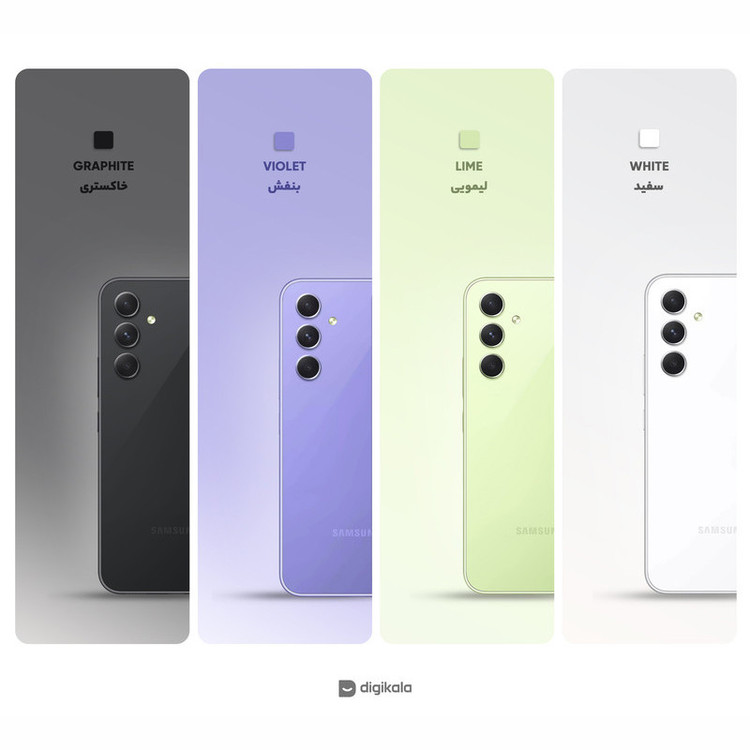 یه نکته مثبت در طراحی و ساخت این گوشی استفاده از گلس برای قسمت پشتی گوشی به حساب میاد که باعث شده کیفیت ساخت گوشی بالاتر بره و دیگه مثل قبل حس یه گوشی اقتصادی و ارزون رو به شما نده. البته استفاده از گلس باعث براق شدن گوشی و راحت کثیف شدن میشه و برای جلوگیری از این موضوع بهتره از یه قاب محافظ برای اون استفاده کنید. متریال جدید استفاده شده باعث افزایش وزن گوشی به حدود 202 گرم شده، ولی به خاطر ابعاد و اندازه مناسب و نوع طراحی هنوز a54 گوشی خوش دستی به حساب میاد و توی استفاده طولانی مدت خیلی اذیت نمیشید. پایین قسمت پشتی هم لوگو SAMSUNG جا خوش کرده. علاوه بر رنگ های مشکی و سفید دو رنگ لیمویی و بنفش به این نسل اضافه شده که در کنار طراحی براق قسمت پشتی جلوه زیبایی به گوشی میده.